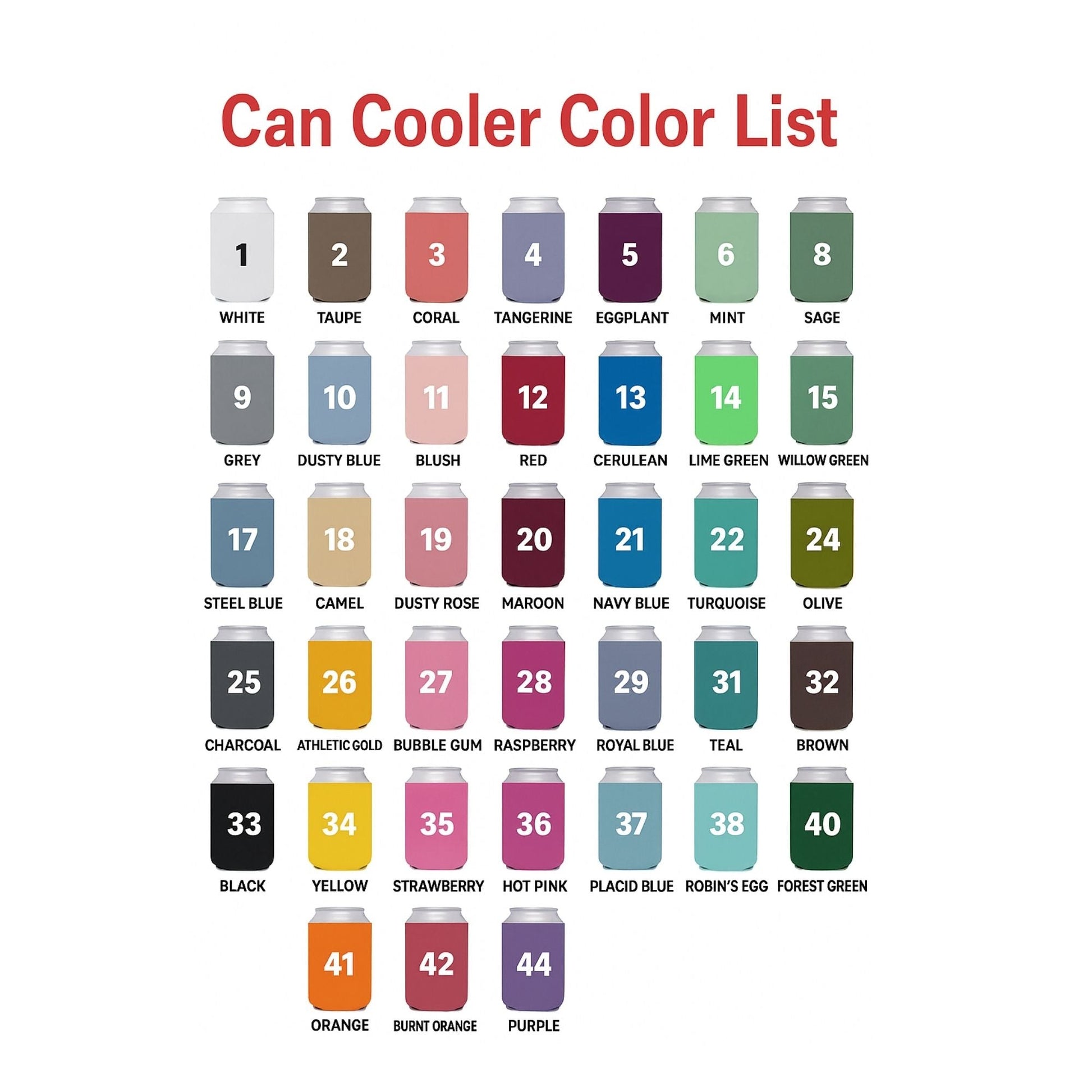 Note: For the best print visibility, avoid pairing dark ink with dark can cooler colors or bright ink with bright can cooler colors. Choose a high-contrast combination between your cooler color and print color to ensure your design stands out clearly.